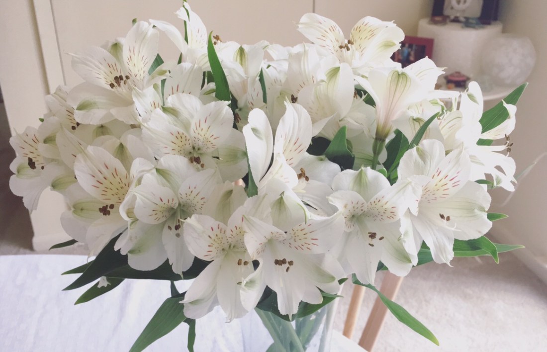 after receiving a lot of flowers for valentine’s day, i realized that i really love having fresh flowers in the house. every week or so, i try to pick up a new bouquet to keep me company at the dining room table at night when i’m studying. this week i got fresh white alstroemerias, which are my favorite flower.